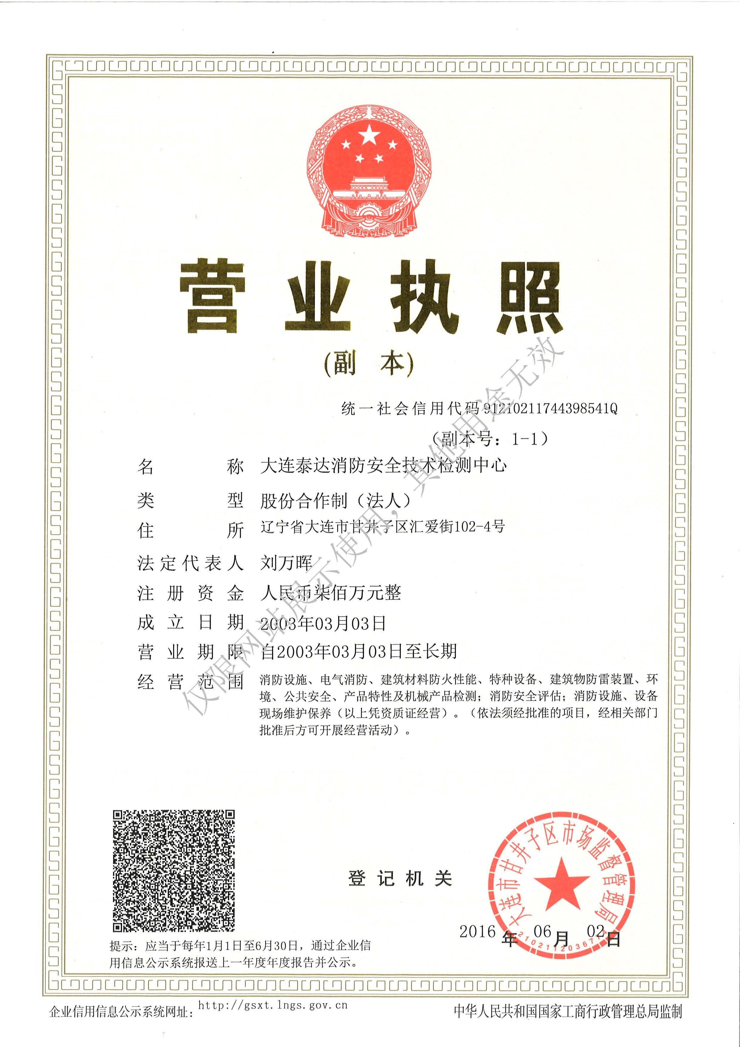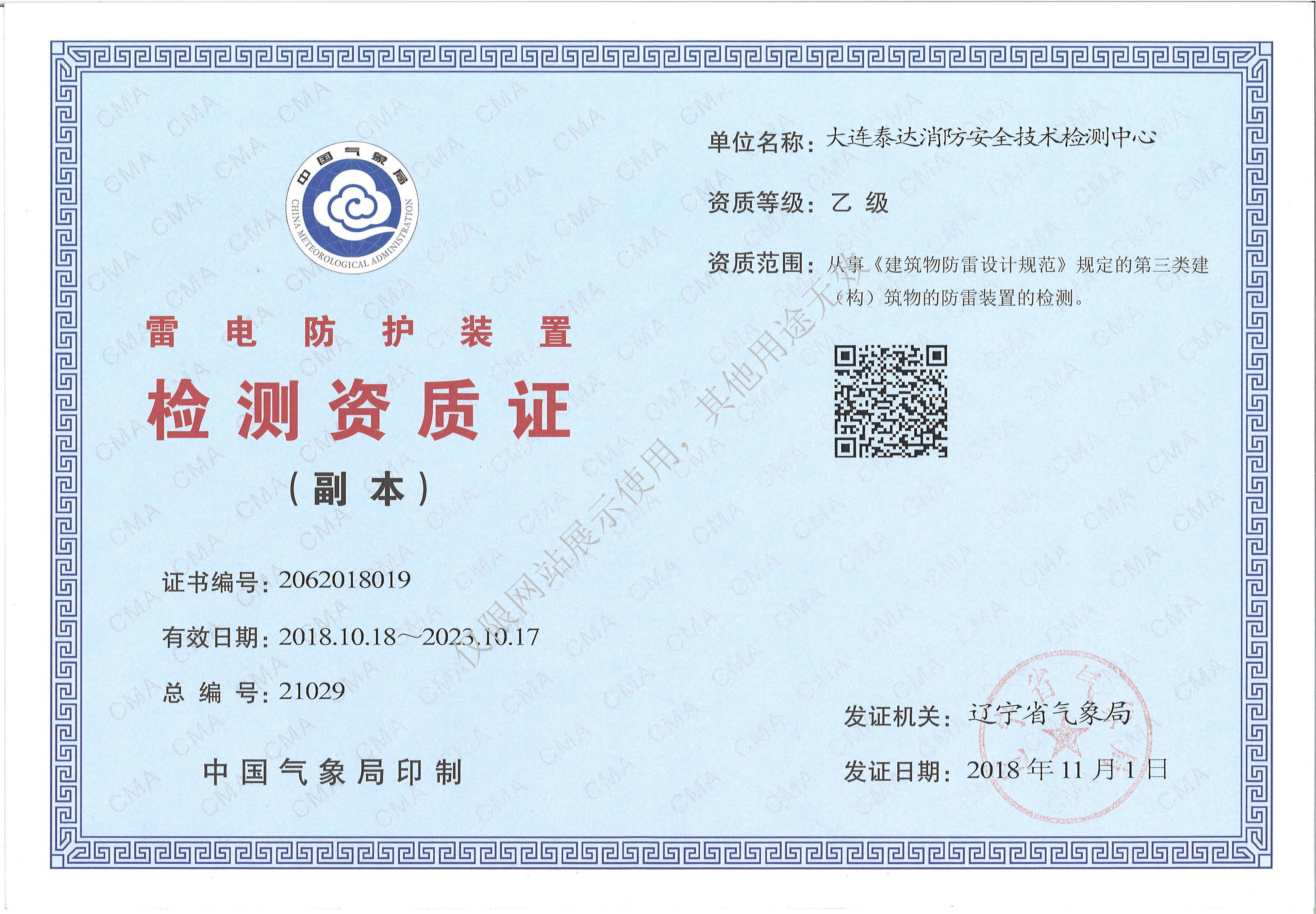 · 是經(jīng)“社會(huì)消防技術(shù)服務(wù)信息系統(tǒng)”備案并公示的消防技術(shù)服務(wù)機(jī)構(gòu),已取得中國氣象局頒發(fā)的雷電防護(hù)裝置檢測(cè)資質(zhì)證書、遼寧省質(zhì)量技術(shù)監(jiān)督局審核批準(zhǔn)的檢驗(yàn)檢測(cè)機(jī)構(gòu)資質(zhì)認(rèn)定證書(CMA)及包括消防檢測(cè)、電氣檢測(cè)、雷電防護(hù)裝置檢測(cè)、防火涂層厚度檢測(cè)等在內(nèi)的200余項(xiàng)檢驗(yàn)檢測(cè)能力,取得大連市應(yīng)急管理局頒發(fā)的安全生產(chǎn)標(biāo)準(zhǔn)化證書,獲得質(zhì)量管理體系、環(huán)境管理體系、職業(yè)健康安全管理體系認(rèn)證證書,是經(jīng)備案的高新技術(shù)企業(yè),可獨(dú)立出具具有證明作用的檢測(cè)報(bào)告。